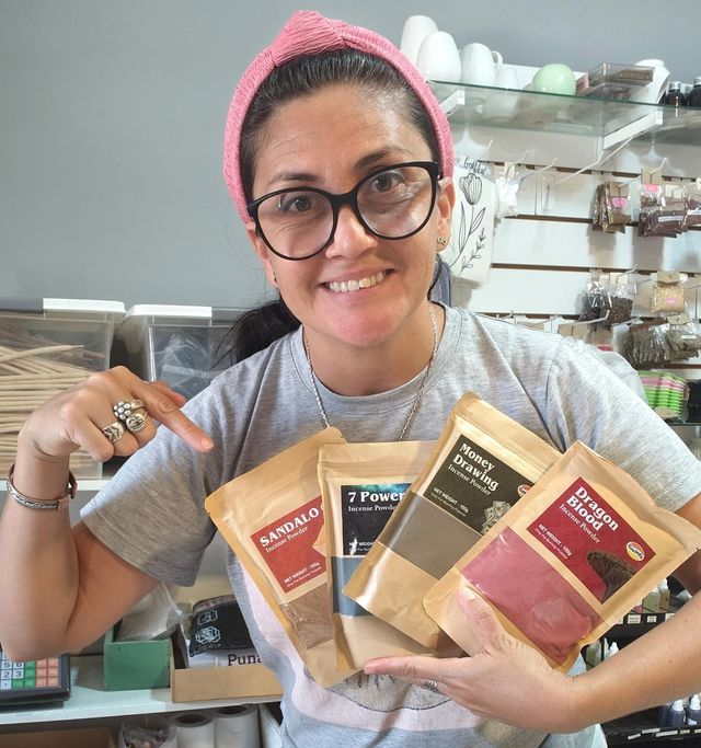 Sándalo, 7 poderes, sangre de drago. Hace la mezcla reemplazando la harina de madera x el polvo. Proporción: 3 gr de goma Xántica 100 grs del paquete de resina. Pone en tu manga y comenza a hacer tus sahumerios hindúes. Rinde aprox 90 unidades (cada 100 gr)